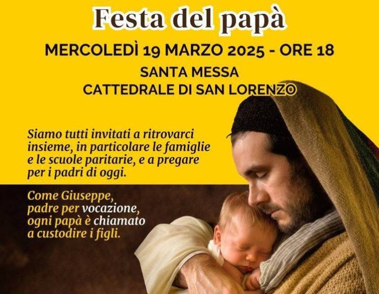 Mercoledì 19 marzo, solennità di San Giuseppe, sposo della Beata Vergine Maria e padre putativo di Gesù, per il secondo anno consecutivo la Diocesi offre un momento insieme per festeggiare tutti i papà.Alle ore 18 in Cattedrale la S. Messa a cui sono invitate tutte le famiglie e gli istituti scolastici paritari gestiti dai religiosi. “Vogliamo offrire … Leggi tutto 19 marzo: in Cattedrale la celebrazione per la festa del papà